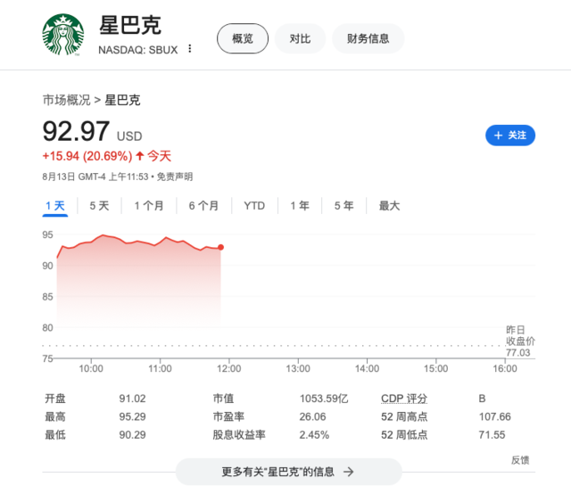 受更换CEO消息提振,星巴克股价周二盘中大涨20.69%,报92.97美元。TD Cowen分析师Andrew Charles将星巴克评级上调至买进(之前为持有评级),目标价105美元——意味着存在上涨11%的空间。